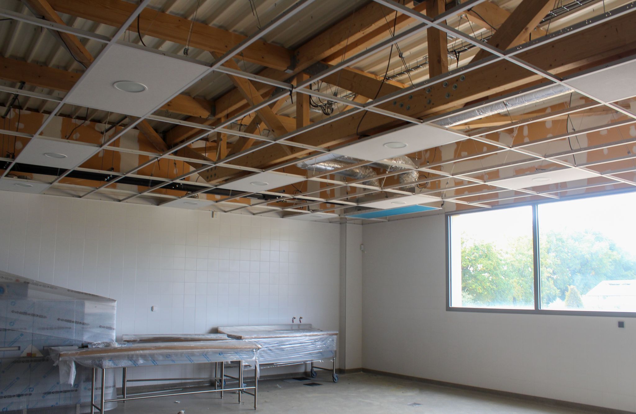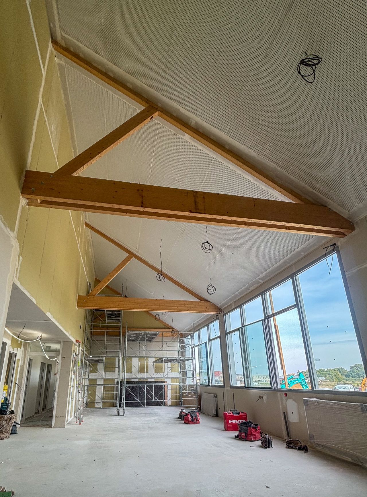 • Installation des plafonds perforés acoustiques Createx 8/18R pour un meilleur confort sonore au réfectoire.
